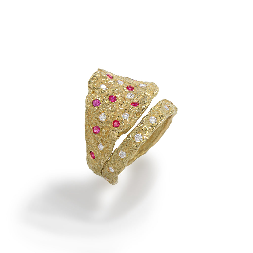 The Magia! ring is a beautiful wrap of textured 18k yellow gold with undefined, fluid edges that feel alive on the hand. Accented with diamonds and rubies, its scattered flashes of light and color bring vitality and openness to the magical energy of the piece.
