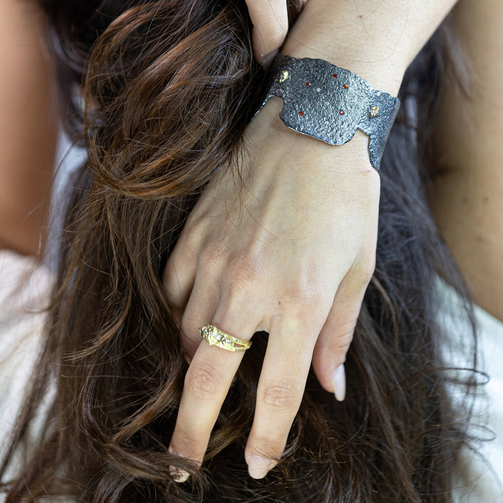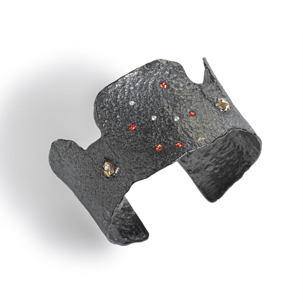 A bold Magia! cuff in blackened sterling silver with 18k yellow gold accents, sapphires, and diamonds. The rich contrast and gemstone detailing give this piece a regal presence, wearable magic that adorns the wrist with strength and elegance.