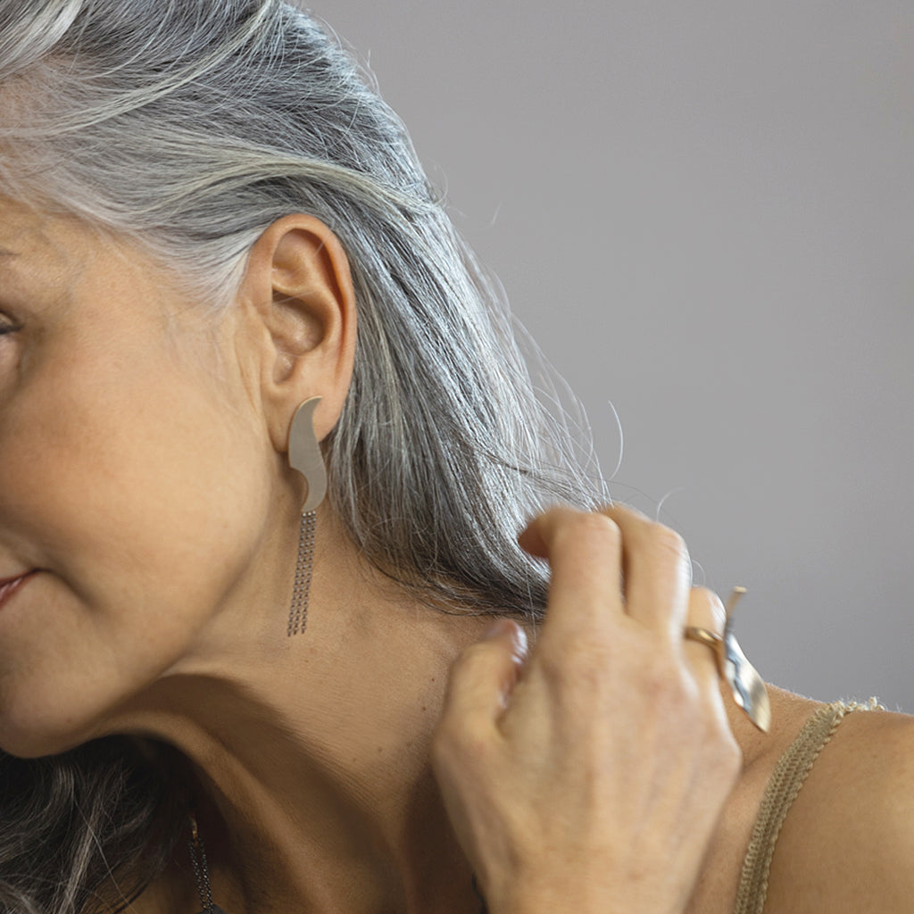 These I AM LOVED earrings feature matte bronze pieces with polished shiny edges, showcasing a graceful fluid and curved shape. From each bronze element, delicate blackened sterling silver chains hang, adding movement, playfulness, and a touch of personality to the design.